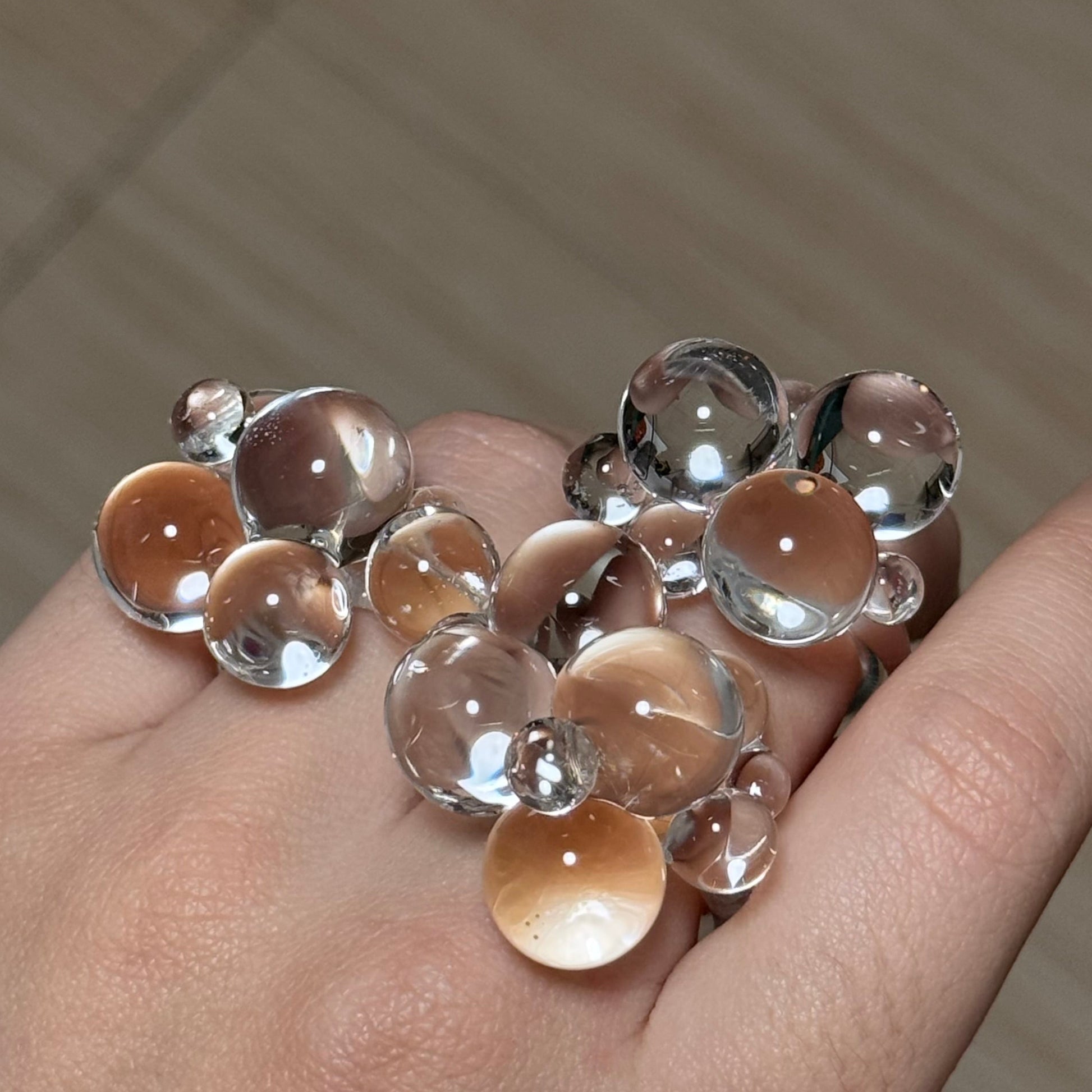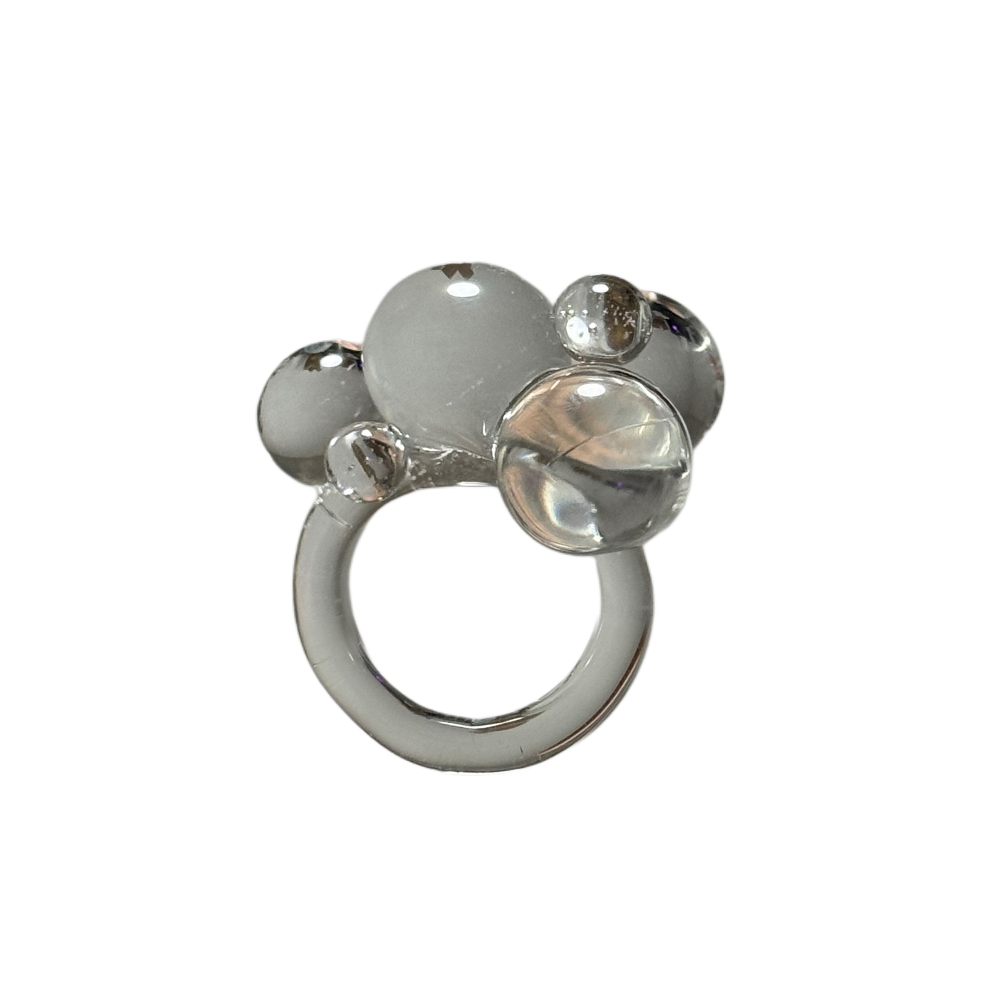 Anillo de vidrio borosilicato con forma de pompas, hecho a mano, por lo que ninguna pieza es igual a otra.