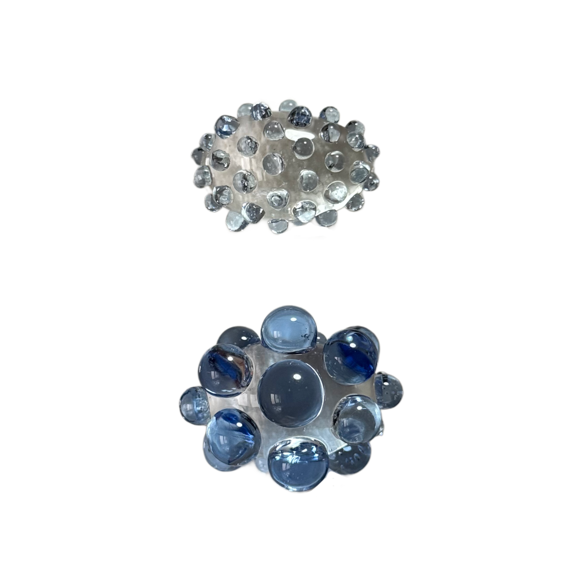 Anillo de vidrio borosilicato con base transparente y detalles en azul celeste.