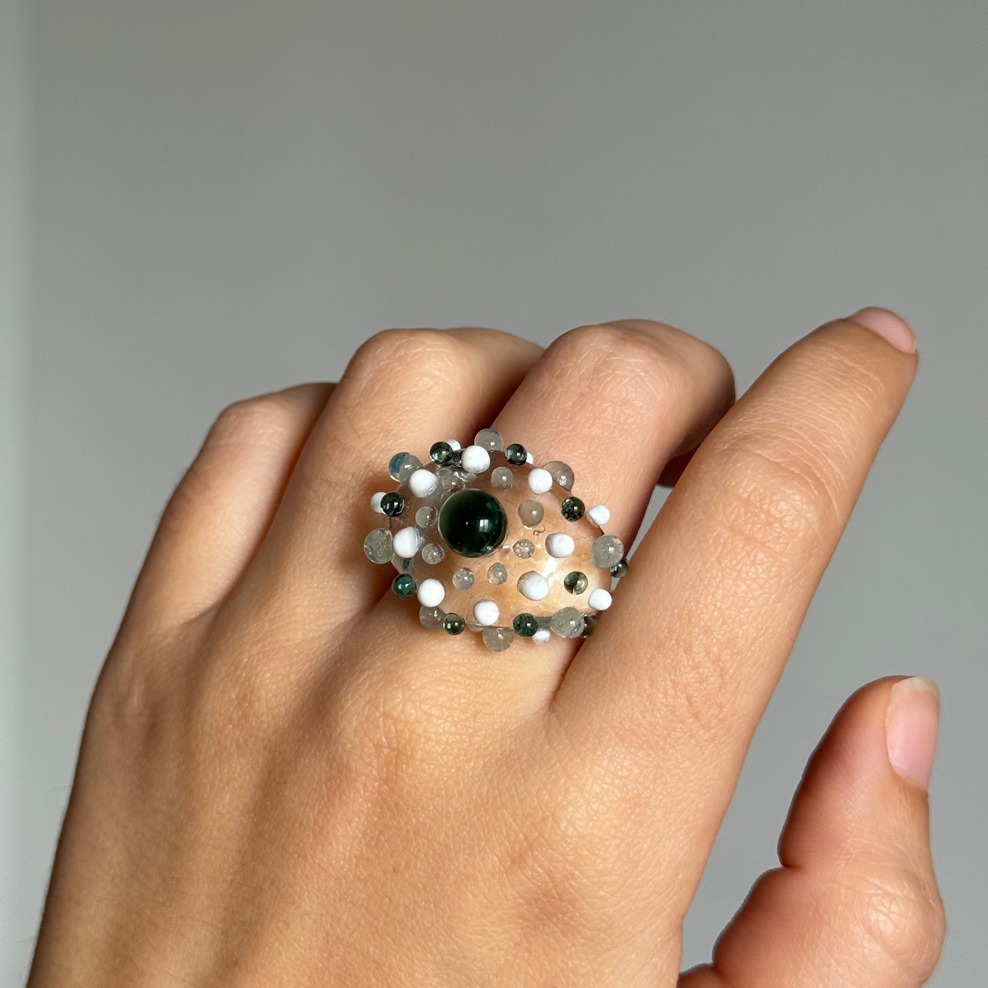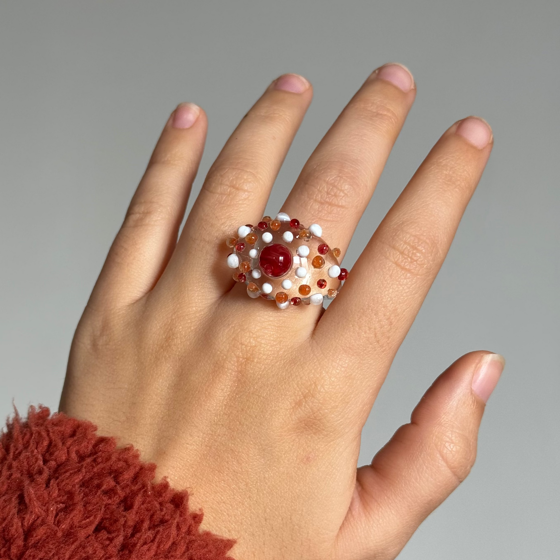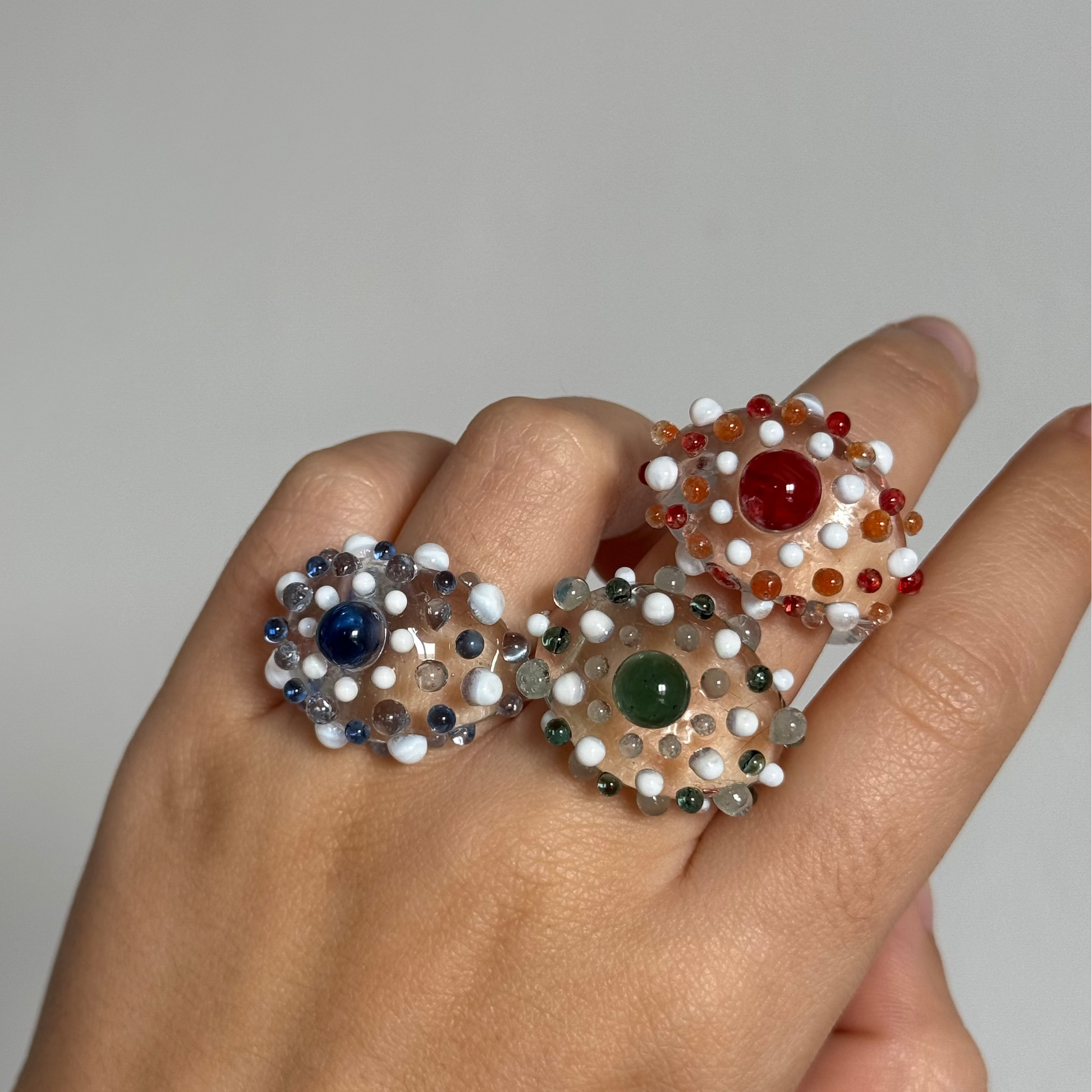 Anillo de vidrio borosilicato transparentes con detalles en diferentes gamas de colores. Hecho a mano y a medida.